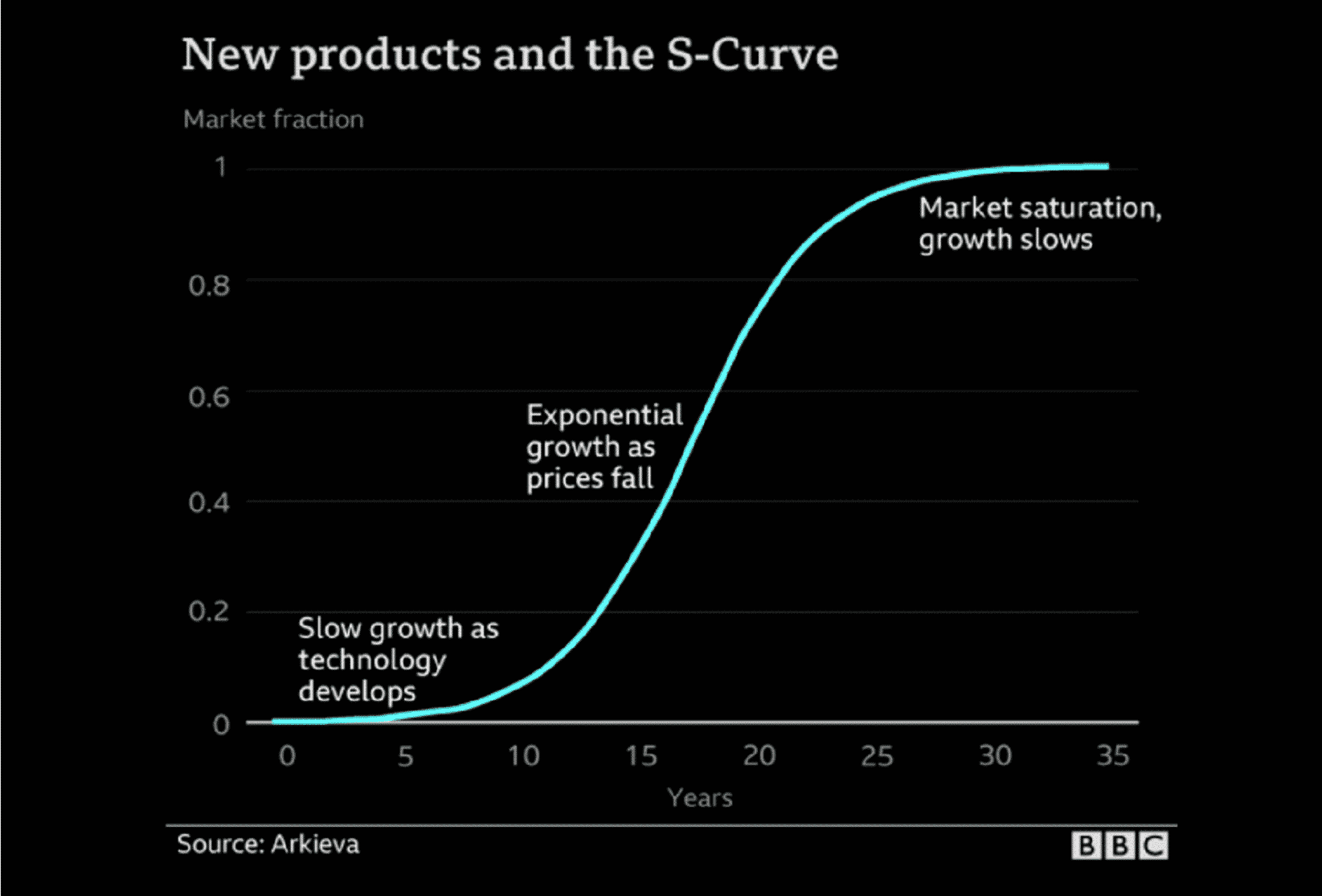 We saw a similar pattern of a slow start and exponential growth. As well as slowdown to a mature market with photography and smartphones even antibiotics. The last century followed the same trajectory by the internal combustion engine. So did printing presses as well as steam engines. Even then the internet, they have a more venerable.